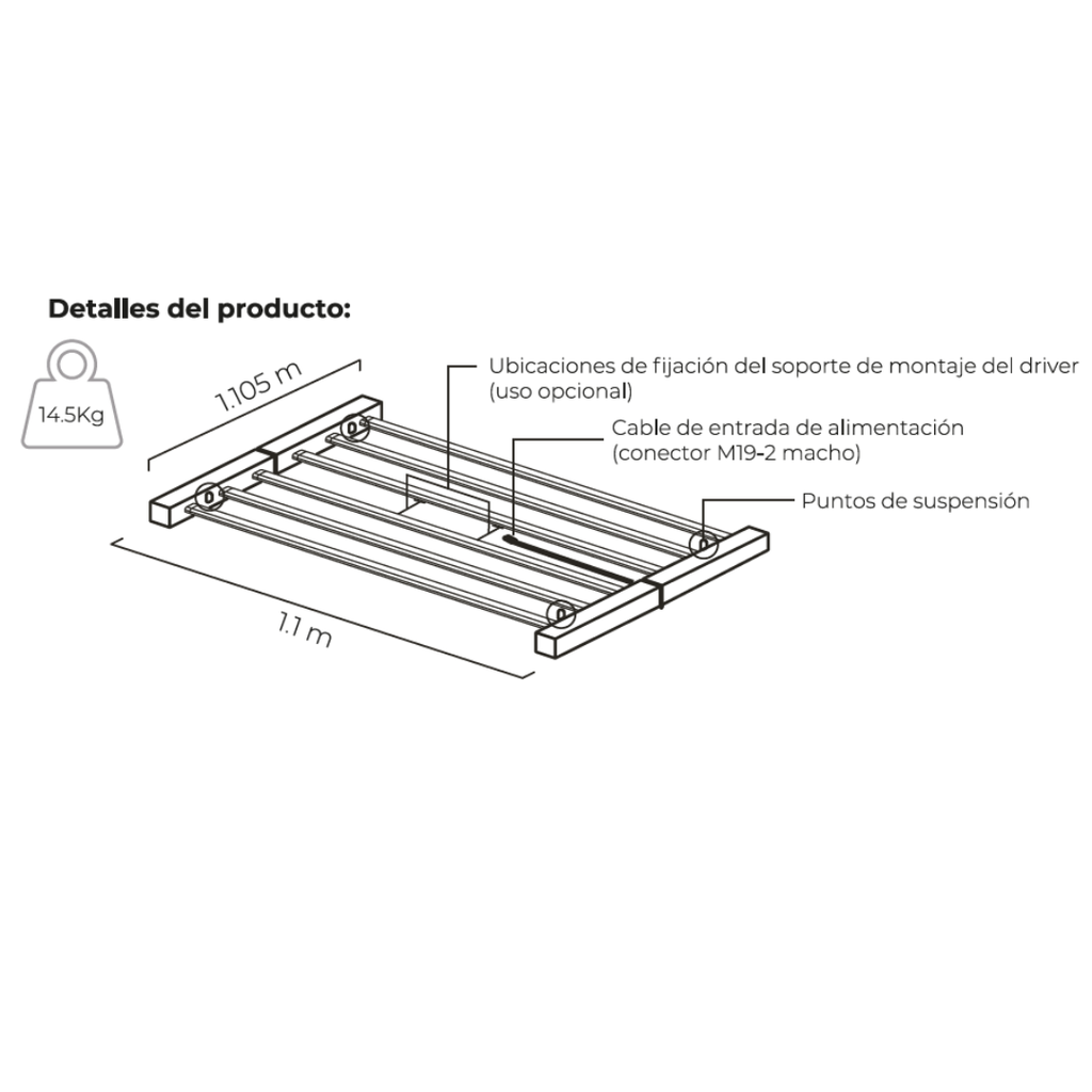 - Driver regulable: Con puerto 0-10V para ajustar la potencia de manera precisa.
