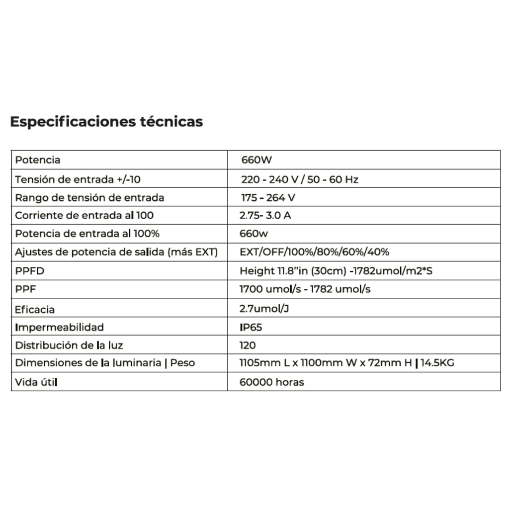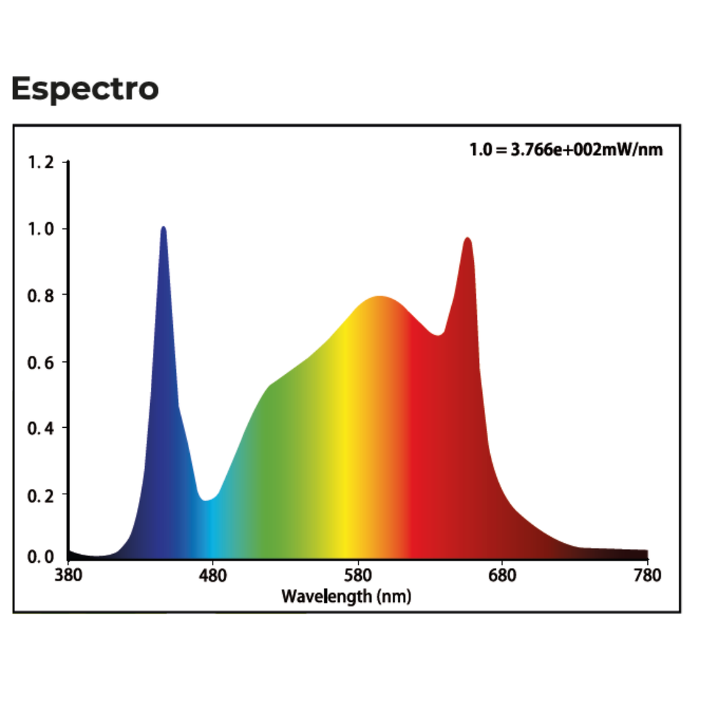 - PPFD (a 30 cm de altura): 1840 umol/m²*s.